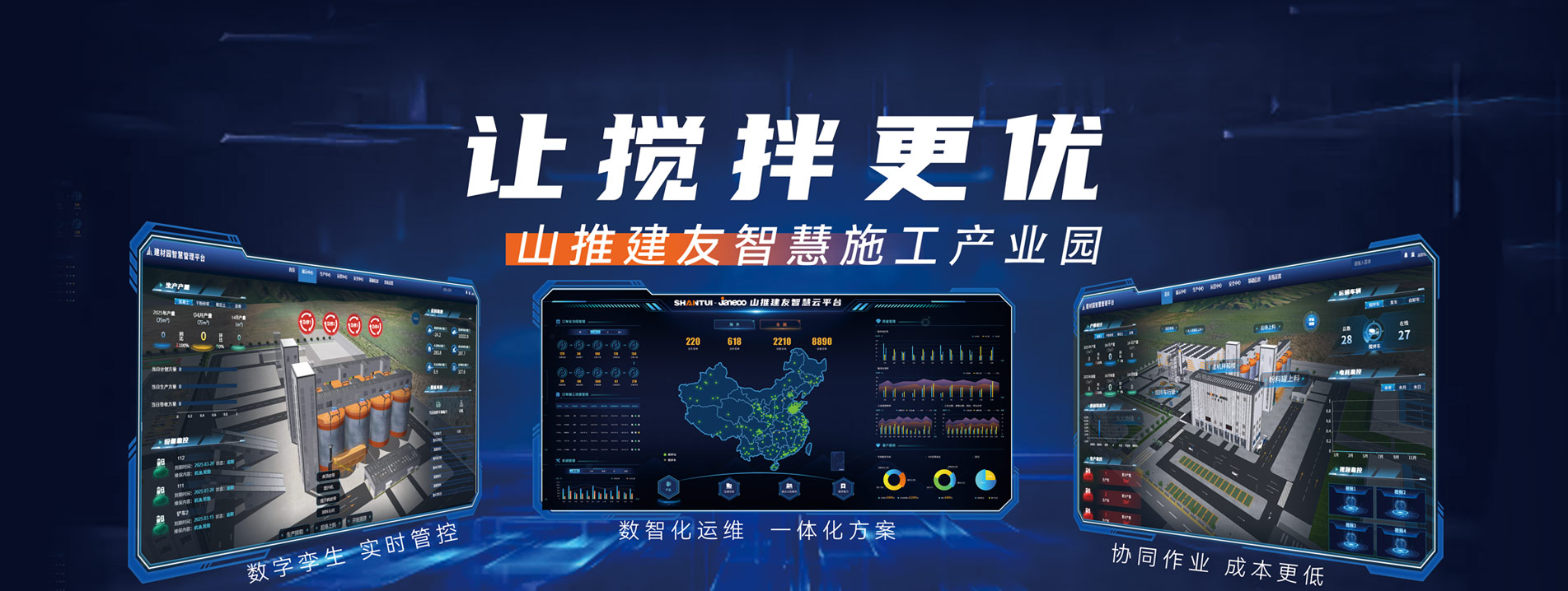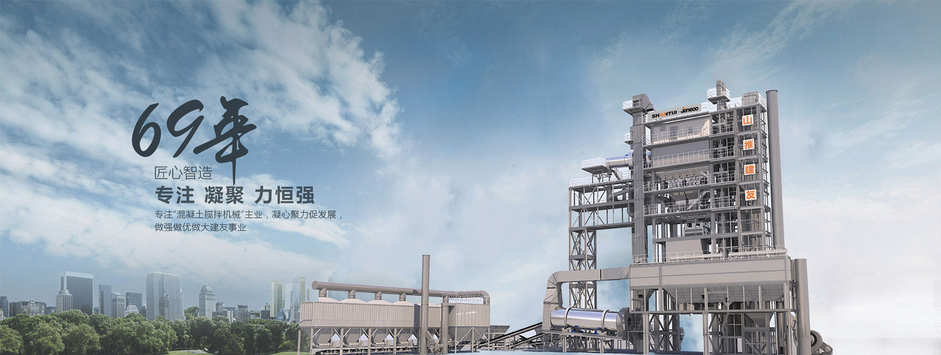 山推建友機械股份有限公司主營混凝土攪拌站、瀝青攪拌站、穩定土拌合站、干混砂漿站、制砂站、破碎線、混凝土攪拌運輸車、圾處理設備及拖泵、砂石分離機等各類攪拌機械。